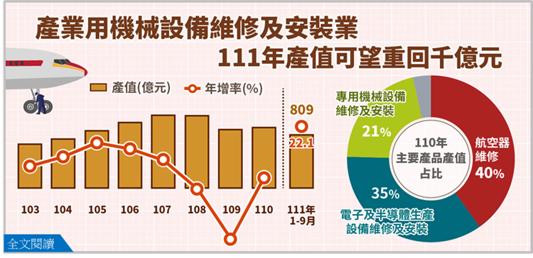 110年產業用機械設備維修及安裝業產值轉正成長。航空器維修、電子及半導體生產設備維修及安裝、專用機械設備維修及安裝為3主產品